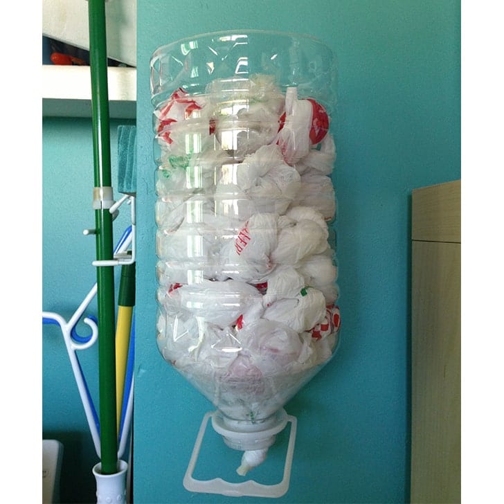 おそらくプラスチック袋をディスペンスできる製品があるはずですが、それを追跡する前に、プラスチックボトルでDIYできます。このハックに必要なものは、水ディスペンサーとして使用されるタイプの空のボトル、再利用するプラスチック袋、そして壁に取り付けるためのメカニズムです。