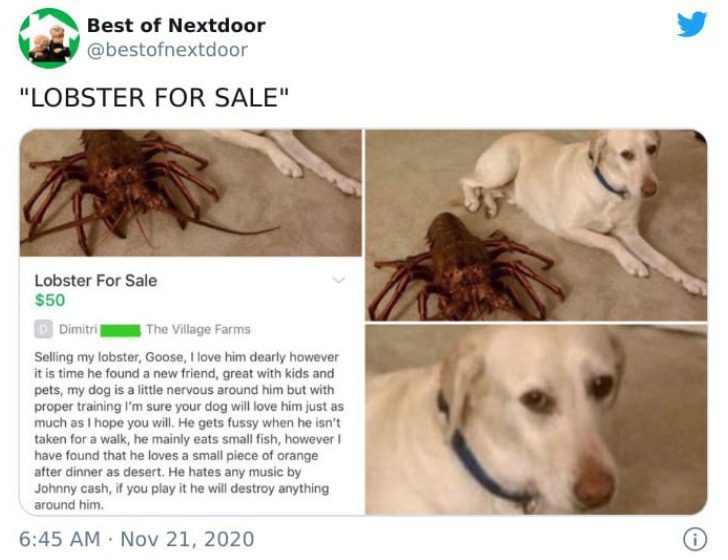 Judging by that dog’s expression, he isn’t too pleased that he has to share his space with the lobster and will be glad when it finds a new home. Even so, we’re not sure how easy it will be for that crustacean to find a new place to call home.