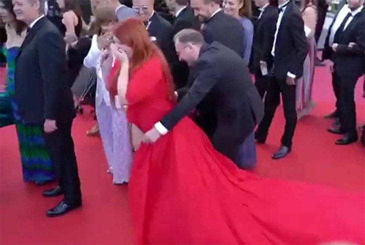 Yulia Rybakova found herself in an unforgettable predicament at Cannes when her flowing red gown became a liability. As she posed for cameras, someone accidentally stepped on the long train, yanking it loose from the waist and pulling the fabric. Photographers captured the entire moment as assistants rushed in to rescue her, while Yulia smiled through the chaos.