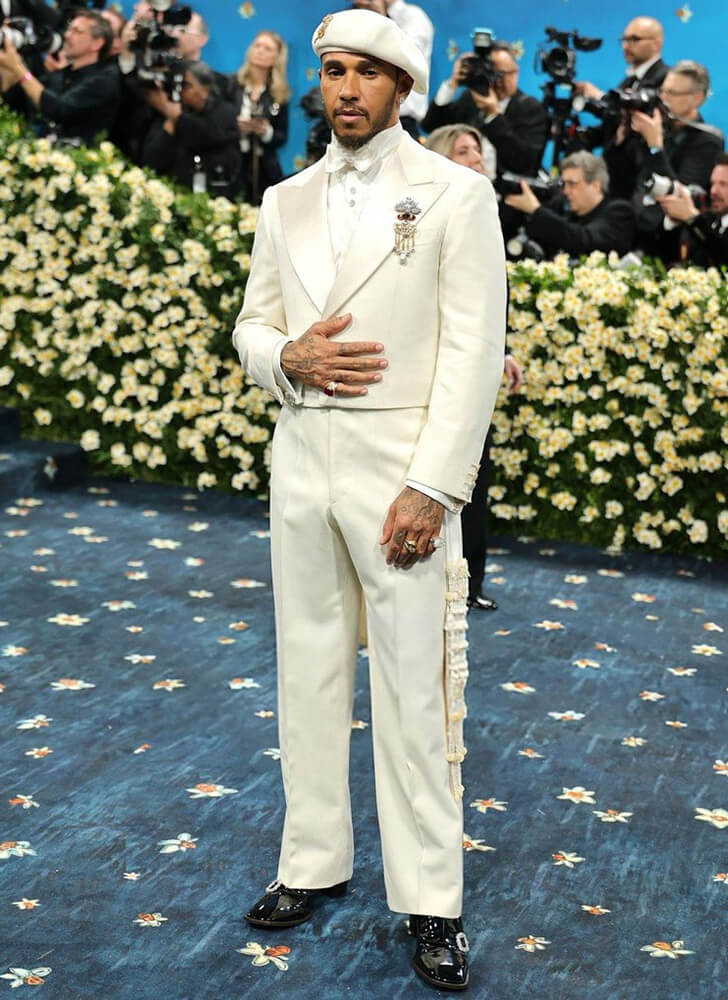 Lewis Hamilton made a profound fashion statement at the 2025 Met Gala. As both a seven-time F1 world champion and the event’s co-chair, he showed up in a custom ensemble that mixed modern tailoring with deep cultural meaning. Teaming up with London designer Grace Wales Bonner and stylist Eric McNeal, Lewis wore a sharp ivory wool tailcoat with high-waisted tuxedo pants, a silk bow tie, and a crisp white shirt.