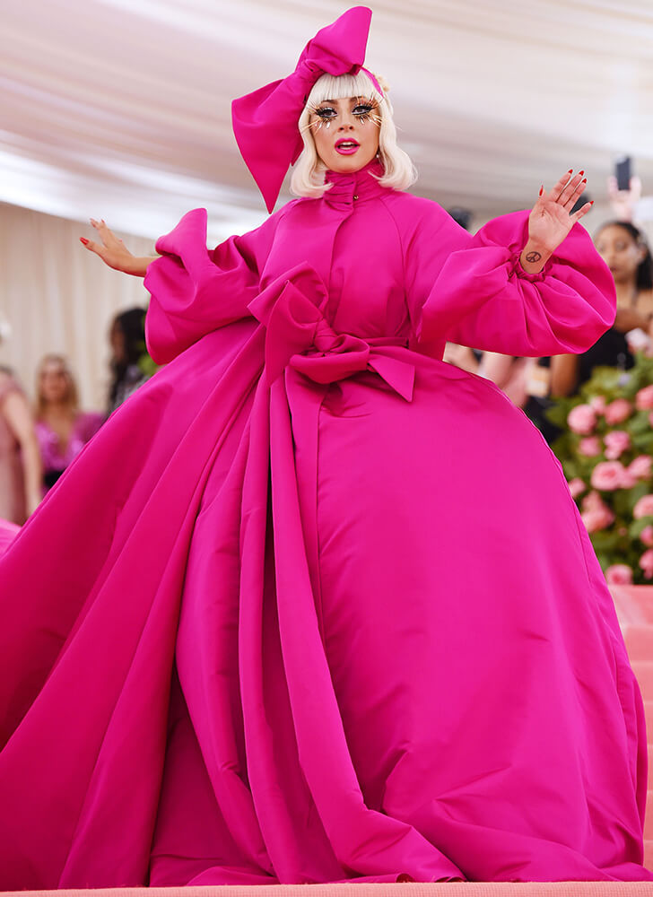Lady Gaga totally stole the show at the 2019 Met Gala. She embraced the “Camp: Notes on Fashion” theme and worked with her longtime friend and stylist, Brandon Maxwell. Gaga arrived in a dramatic hot pink gown with massive sleeves and a train that was 25 feet long. And of course, she wasn’t alone—she had dancers and an umbrella-carrying crew with her.