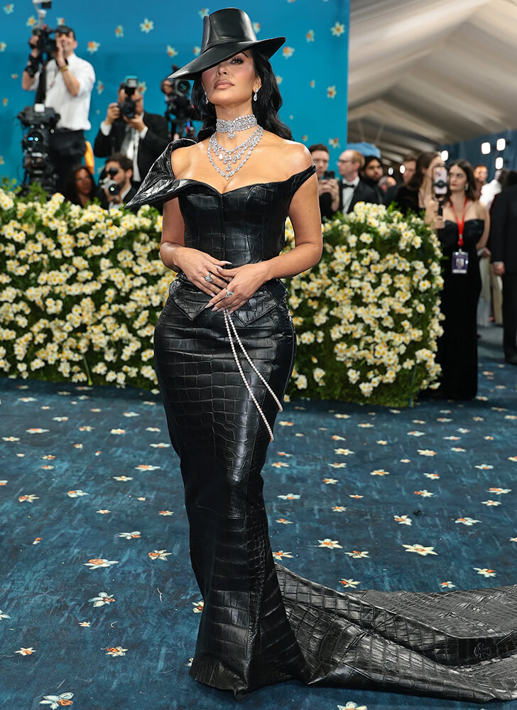 Kim Kardashian showed up to the 2025 Met Gala in a look from Chrome Hearts, the L.A. brand famous for its edgy, rocker vibes. She wore a black crocodile-embossed leather two-piece set that was pure statement-making gold. The top was off-the-shoulder, with a dramatic open back and a fitted waist, paired with a floor-length skirt that had a killer train.