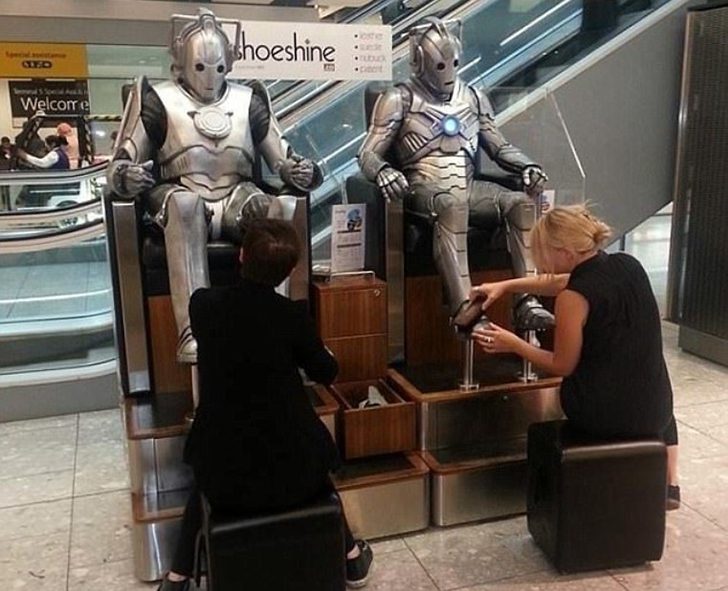 The best part is how casual everyone around them seems. Two fully suited robots sitting at a shoeshine station? Just another day at the airport. Somewhere between sci-fi fantasy and awkwardly normal, this moment perfectly captures the blend of chaos and comedy that only travel hubs can produce.