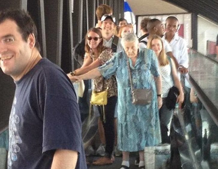 Leading the charge is one fearless grandma, gripping the rail like a pro and setting the pace for everyone behind her. She’s not in a rush, and judging by the line of travelers patiently trailing along, no one else dares to be either. It’s less of a queue and more of a gentle pilgrimage led by a woman who’s clearly seen it all.
