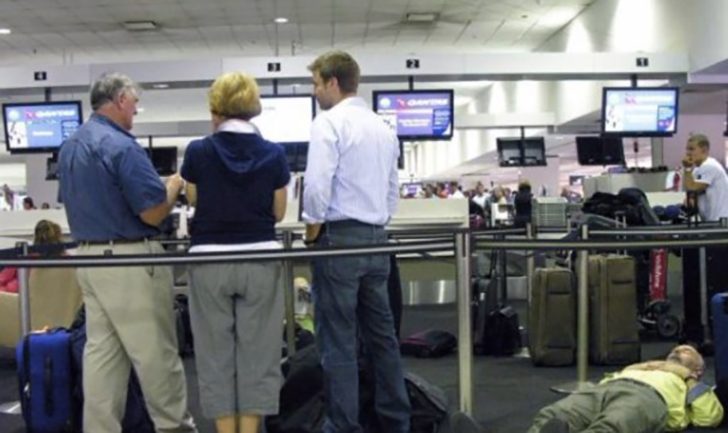 The group beside him seems completely unbothered, carrying on their conversation like there isn’t someone lying inches away. Maybe this isn’t his first time pulling this move. Or perhaps they’ve reached that collective airport acceptance phase, where nothing surprises you anymore, not even a mid-line snooze.