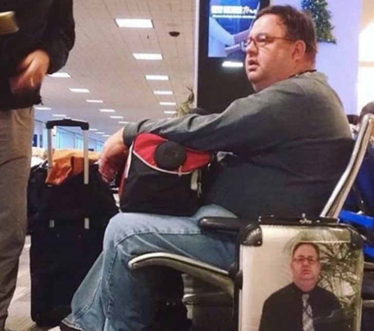 This man may have cracked the ultimate code for preventing lost luggage. Instead of relying on colorful ribbons or random stickers, he went straight for a full-on portrait of himself printed across his suitcase. After all, who’s going to risk walking off with a briefcase that literally has the owner staring back at them? It’s the ultimate anti-theft deterrent.