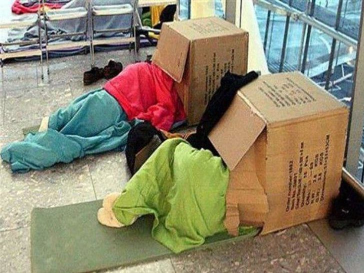 The boxes serve as blackout shades, privacy screens, and possibly even soundproofing from nearby announcements. Not only did they find a way to block out the light, but they also avoided the awkward eye contact that comes with sleeping in public. Sure, it’s not five-star accommodation, but in the wild world of airport layovers, this is what winning looks like.