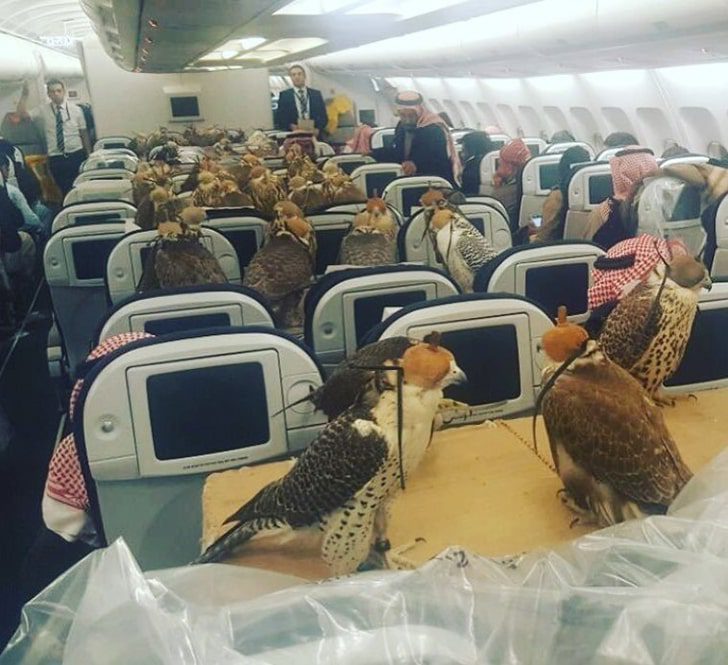 Some people fly with emotional support animals, and then there’s this. An entire cabin filled with falcons, each sitting calmly in its own seat like a very dignified passenger. Reports indicate that a Saudi royal purchased dozens of tickets so his birds could travel in comfort, transforming this flight into a true sky-high aviary.