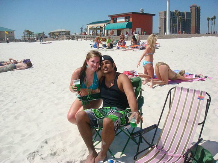 At first glance, this looks like a sweet couple’s vacation photo—just two people enjoying the sun, the sand, and a couple of drinks. They’re relaxed, happy, and utterly unaware that their moment is being completely overshadowed. Nobody is looking at them when the background is serving up a strange kind of impromptu beach workout.