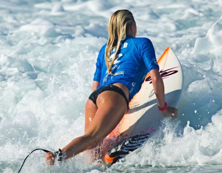 This surfer isn’t just riding waves—she’s turning heads while doing it. With a perfect blend of athleticism and beach-ready confidence, she makes paddling through the surf look like a casual stroll. But let’s be real, her dedication to the craft is only half the reason people are paying attention.
