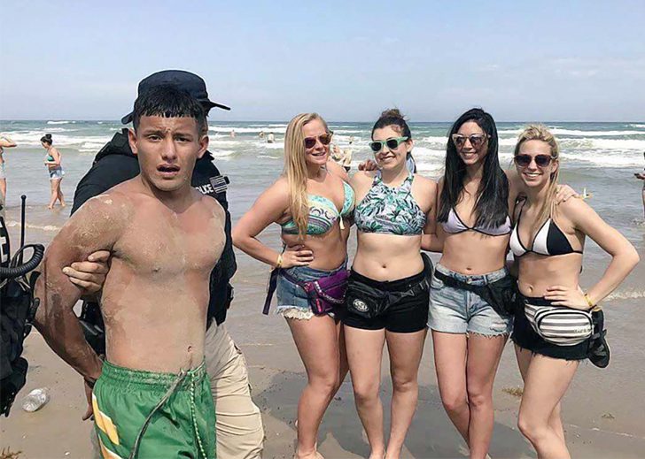 Whatever happened before this shot was taken definitely wasn’t on his spring break itinerary. The contrast is almost too perfect. On one side, carefree beachgoers are ready to post this on social media. On the other, the guy who looks like he just realized his vacation took a turn for the worse. Somewhere in between is a police officer who’s just doing his job.