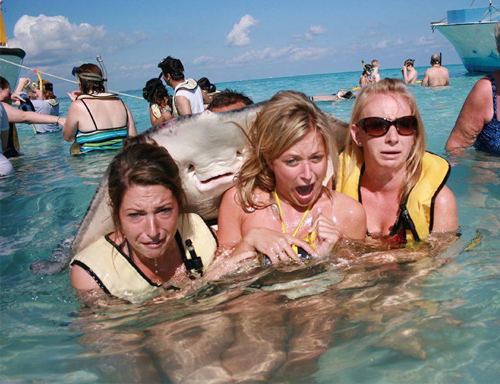 This might be the best case of “third wheel energy” ever captured. These three women went snorkeling only to encounter a sea monster. Sure, it’s just a stingray draped over them like an overenthusiastic party guest, but who wouldn’t be scared? Also, if you look closely, you’ll see the guy behind them holding the creature up. His head’s peeking out like a proud puppeteer who just pulled off his best trick.