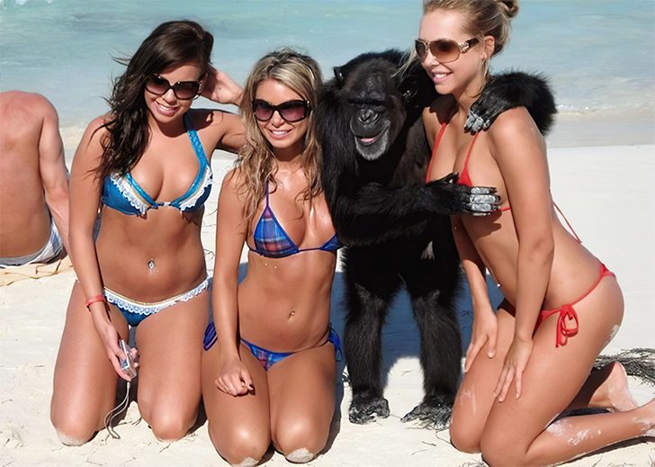 Nothing turns heads quite like a chimp showing up for a beach day, and this little guy is making the most of his moment. With both arms around his new bikini-clad friends, he looks like he’s been waiting for this photoshoot his entire life. The girls seem perfectly fine with this unexpected addition to their crew, while he’s looking extra comfortable—especially with the one in red.