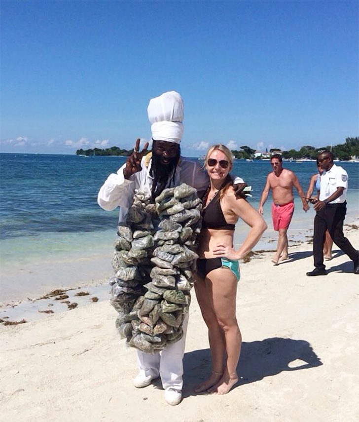 This woman came for a relaxing beach day and somehow ended up in a photo with the most confident businessman on this Jamaican island. He’s proudly displaying his product like it’s part of a high-end fashion line. There’s no need for subtlety here—his marketing strategy is all about volume and visibility.